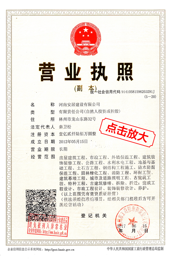 滔滔黃河哺育了中華民族拼搏向上的奮斗精神,巍巍太行造就了中原兒女的紅旗渠精神。百萬林州人下太行,鑄就了中國建筑之鄉響當當的耀眼品牌。河南安居建設有限公司從誕生起血液里就流淌著紅色基因,秉承“安得廣夏千萬間,大庇天下寒士俱歡顏”的擔當精神,用鋼筋混凝土筑起了高樓大廈,也用一流品質、家國情懷打造了安居建設的輝煌成績。公司成立于2012年,注冊資金12600萬元,公司成立至今,擁有建筑,市政施工總承包等十項一級資質;其他二級等資質共二十余項。公司秉承質量第一,服務為主,堅持垂直管理,從不設立分公司等分支機構。
